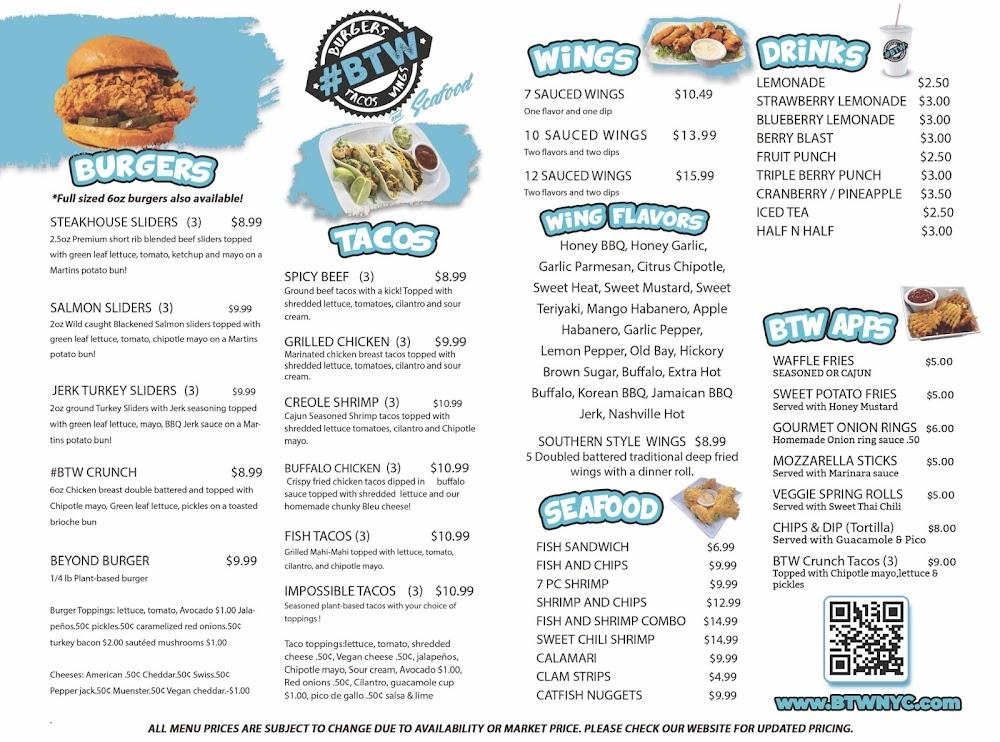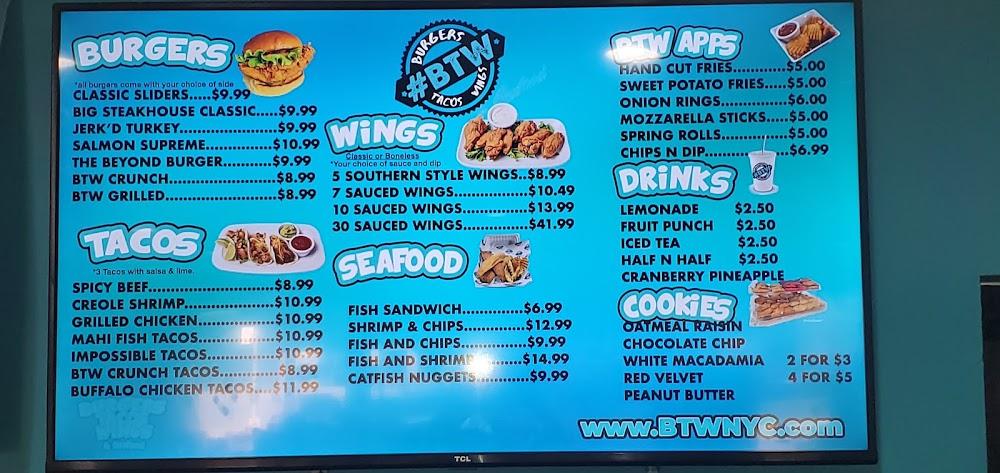 Welcome to Burgers Tacos Wings & Seafood, your go-to destination for freshly prepared American fast food! Located in Jamaica, NY, we specialize in mouthwatering burgers, flavorful tacos, crispy wings, and delectable seafood, all made with the highest quality ingredients. Our menu caters to everyone, with options for vegetarians and halal dishes. Enjoy convenient services like takeout, delivery, and drive-through while catching your favorite sports. Our inviting space is fully accessible, ensuring everyone can savor our delicious offerings. Check out our website for online orders and exciting promotions. Experience freshness and flavor at Burgers Tacos Wings & Seafood today!